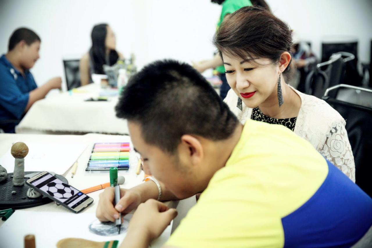 圖為盛世投資首席運營官秦曉娟女士陪同自閉癥兒童繪畫