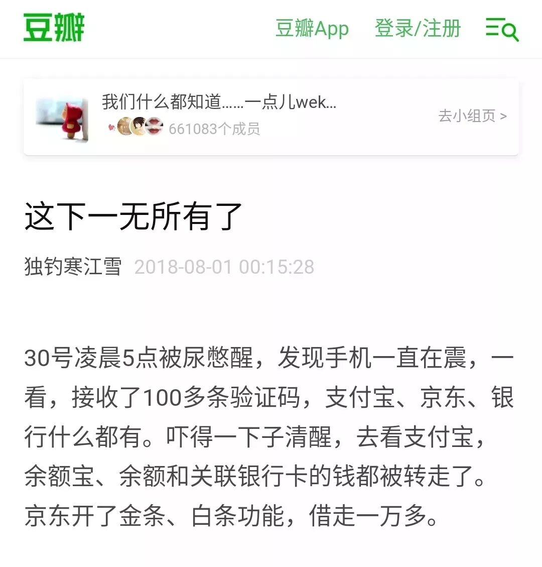 本君今天在逛豆瓣的時候,看到網友@獨釣寒江雪 的發帖,說是自己凌晨醒來,發現手機一直在接收驗證碼,總共100多條,分別來自支付寶、京東、銀行等。