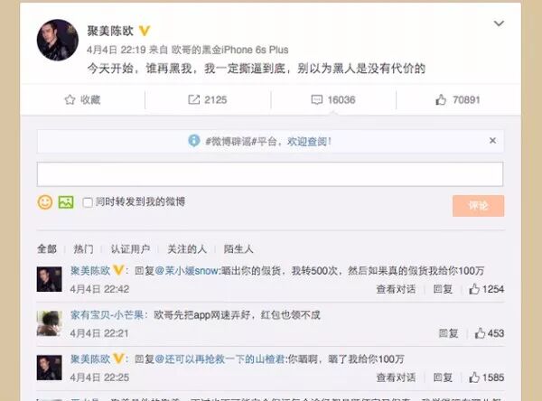 為維護(hù)聚美優(yōu)品的正面形象,陳歐不惜在其微博上與網(wǎng)友嗆聲,稱如果在聚美上買到假貨,驗(yàn)證后,愿意賠償一百萬(wàn)。陳歐此舉看似光明磊落,力證聚美優(yōu)品絕對(duì)沒(méi)有假貨,但顯然有些用力過(guò)猛,網(wǎng)友并不買賬。