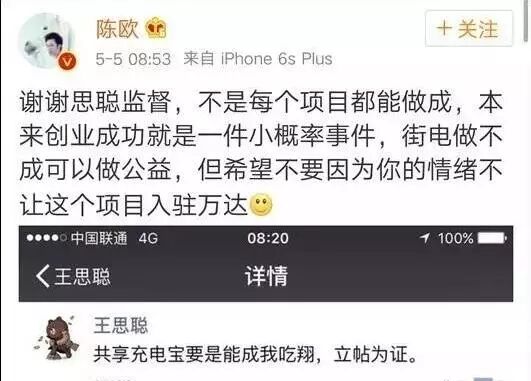 在聚美優(yōu)品的頻繁跨界中,最具影響力的就是投資共享充電寶街電了。而街電的意外走紅,又與陳歐、王思聰兩大網(wǎng)紅直接開撕脫不了干系。當(dāng)年,陳歐高調(diào)宣布投資街電,王思聰直接微博嗆聲不看好。