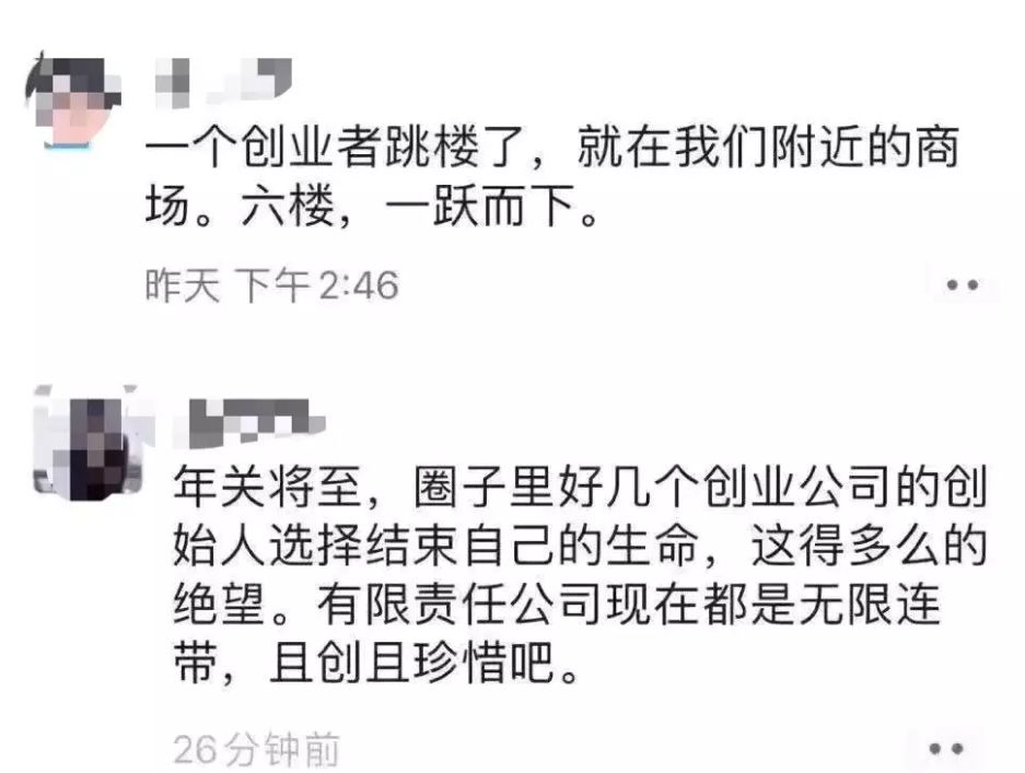 這并非個(gè)例,有人透露,“年關(guān)將至,圈子里好幾個(gè)創(chuàng)業(yè)公司的創(chuàng)始人選擇結(jié)束自己的生命,這得多么的絕望。”