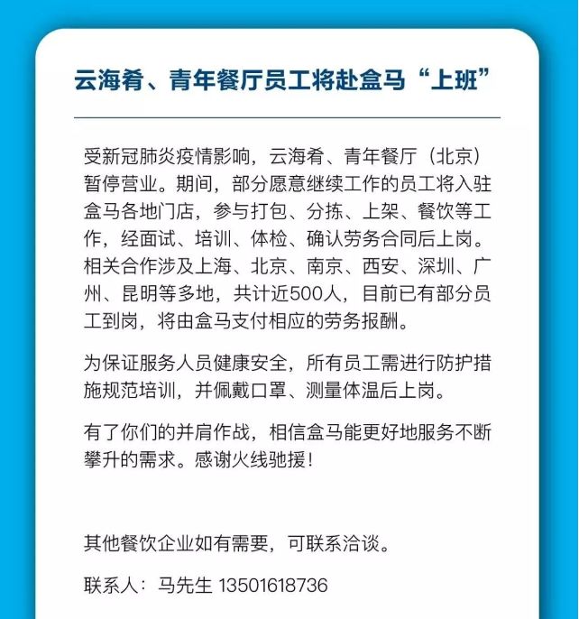 2月3日,盒馬官方微博發布消息稱,疫情期間聯合知名餐飲企業進行合作,采用勞務用工方式,接收云海肴、青年餐廳(北京)部分員工,入駐盒馬各地門店,參與打包、分揀、上架、餐飲等工作;相關合作涉及上海、北京、西安、深圳、廣州、昆明多地,共計500人;目前已有部分員工到崗。盒馬將支付相應的勞務報酬。