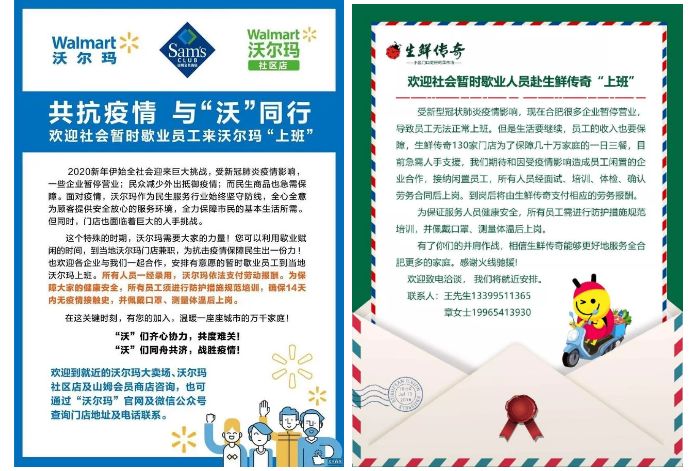 除此之外,沃爾瑪、永輝、超市發、生鮮傳奇、金虎便利等也已經紛紛發出號召,歡迎目前友商和鄰業暫停營業的閑置員工來公司“上班”。
