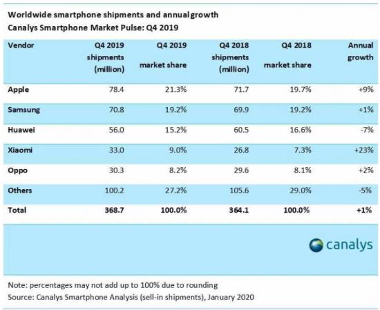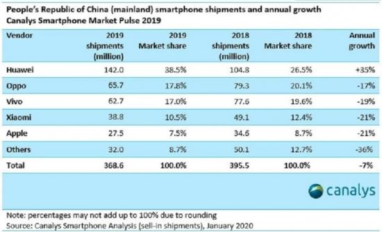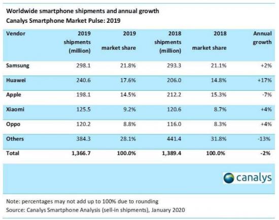 但是,在2019年Q4季度銷量數據中,華為的排名則下滑至全球第三,全球銷量為5600萬臺,市場份額僅有15.2%,銷量同比下滑7%。