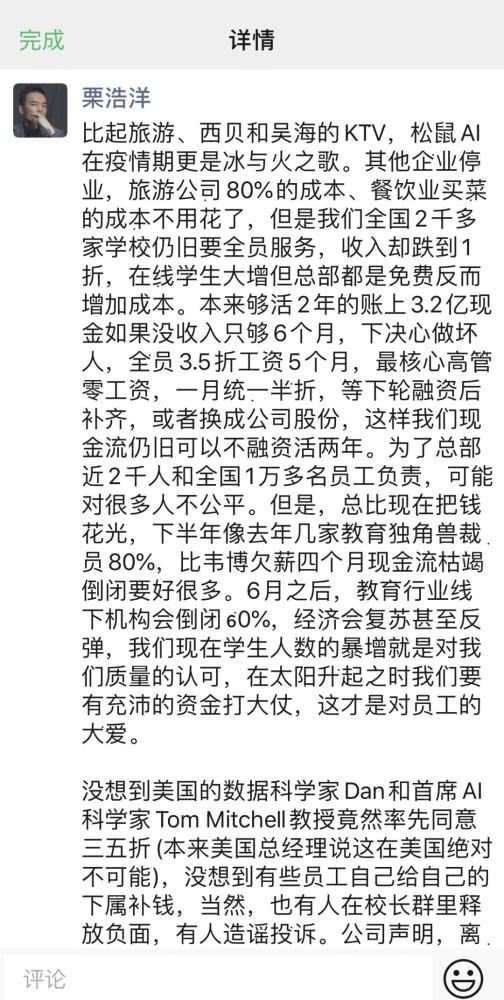 不久前,知名教育創業公司松鼠AI創始人栗浩洋在朋友圈發文表示:“下決心做壞人,全員3.5折工資5個月,最核心高管零工資,一月統一半折。”他還透露本來夠活2年的賬上3.2億現金,如果沒收入只夠6個月,為了長遠著想,只能要求全員降薪自救。