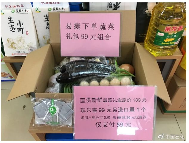 中石化在自己的“易捷加油”APP推出了“安心賣菜”活動。線上下單之后,去加油站之后,員工會給你裝到后備箱里,整個過程“零接觸”。