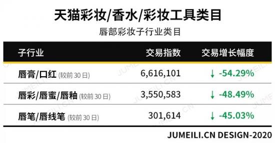 根據天貓數據,1月8日到2月6日的30天交易情況,唇部彩妝交易全部呈現負增長。