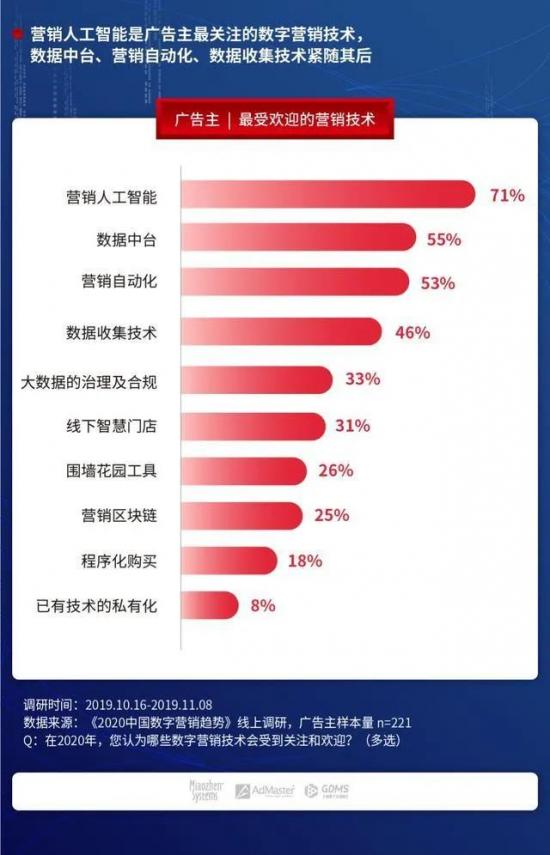 當前,人工智能技術在營銷各環節和場景中不斷滲透,數年技術積累已經被廣泛認可。AI的加持,使得廣告業能夠更好地匹配當下的市場需求,另一方面也引發廣告主需求、用戶訴求產生新的變化,一個好的跡象是,廣告主在AI+營銷方面的預算正在逐漸增高——國際知名咨詢及分析機構Forrester不久前發表全球性調研報告,認為全球55%的營銷決策者在未來會增加營銷科技方面的預算。此外,去年12月,全球數字營銷峰會(GDMS)發布的《2020中國數字營銷趨勢》顯示,2020年營銷人工智能將成為最受廣告主歡迎的數字營銷技術: