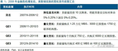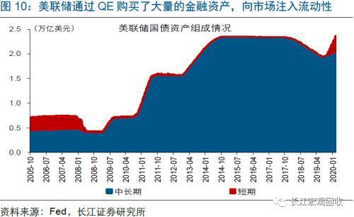 據(jù)長江宏觀固收,回溯歷史,2008年金融危機爆發(fā)后,隨著政策利率降至0%-0.25%,美聯(lián)儲引入了非常規(guī)貨幣政策QE,通過主動購買金融資產(chǎn),向市場注入流動性。
