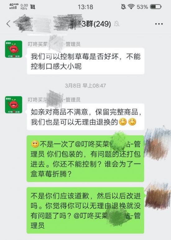 就像出現在出現在黑貓投訴平臺上的叮咚買菜,關于草莓口感問題,平臺已經給出了補償性的20元優惠券,并解釋口感無法控制,不滿意可以無理由退貨。但切身利益確實被損害了的消費者,卻無法滿意這樣的答案。
