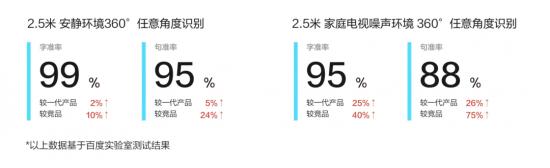 根據百度實驗室的測試結果,在安靜環境2.5米距離內,小度智能音箱2 紅外版360°識別字準率達99%,這一數據比第一代小度智能音箱高2%,比市場上其他品牌智能音箱產品高10%,而句準率95%更是高出競品24%;在家庭電視噪聲環境2.5米距離下,這一對比更加明顯:小度智能音箱2 紅外版360°識別字準率95%、句準率88%,分別較競品提升了40%、75%。