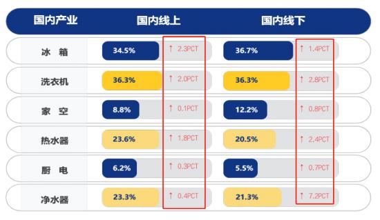其中冰箱、洗衣機線上市場份額分別提升2.3、2.0個百分點,是第二名的3.1、2.1倍,線下市場份額分別提升1.4、2.8個百分點,是第二名的2.2、2.2倍。