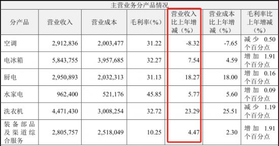 惡劣的環境下,海爾智家的六大業務板塊中除了空調業務受行業拖累之外,其余各業務線都實現了增長,其中電冰箱和洗衣機營收同比增長7.54%和23.29%,廚電營收同比增長18.27%,水家電營收同比增長5.77%,裝備部品及渠道服務營收同比增加10.25%。