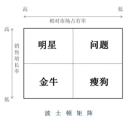 1970年,管理學中誕生了一個著名的波士頓矩陣,根據市場占有率和銷售增長率的高低,將企業的業務劃分為四種——明星類產品、金牛類產品、問題類產品和瘦狗類產品。