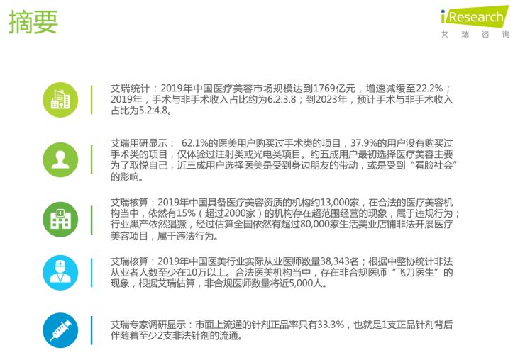 近日,第三方權(quán)威數(shù)據(jù)調(diào)研機(jī)構(gòu)艾瑞咨詢發(fā)布了《中國(guó)醫(yī)療美容行業(yè)洞察白皮書(2020年)》(以下簡(jiǎn)稱《白皮書》)。艾瑞統(tǒng)計(jì)顯示,2019年中國(guó)醫(yī)美市場(chǎng)規(guī)模達(dá)1769億元,行業(yè)高速發(fā)展,成為投資的新熱點(diǎn)。但另一方面,合法合規(guī)開展醫(yī)美項(xiàng)目的機(jī)構(gòu)僅占行業(yè)12%,機(jī)構(gòu)、醫(yī)生、藥品亂象依然是制約行業(yè)發(fā)展的痛點(diǎn)。如何突破醫(yī)美數(shù)十年的“頑疾“,讓更多人受益于醫(yī)美,成為產(chǎn)業(yè)可持續(xù)發(fā)展的關(guān)鍵。