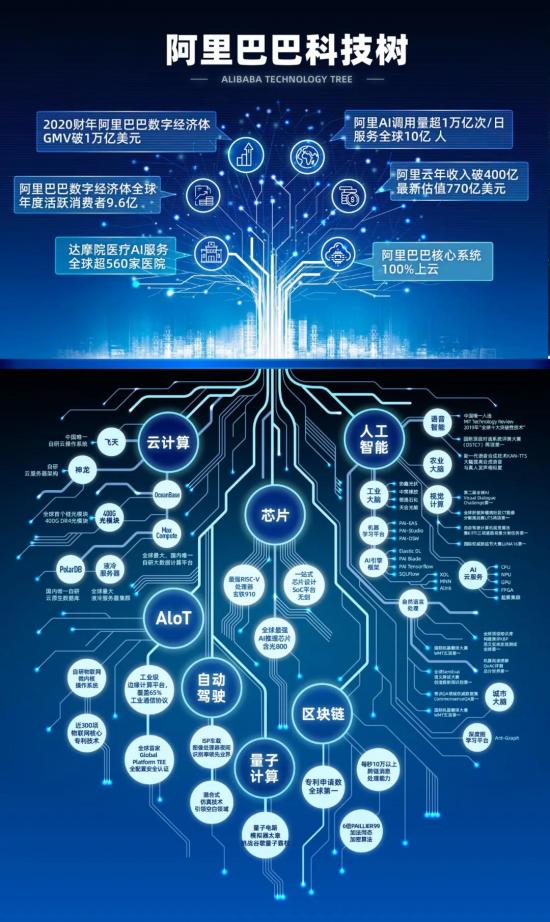 在“大樹”層面,近兩年,阿里巴巴以云計算為中心,先后成立達摩院、平頭哥等研究團隊,在云計算、數據庫、AI等領域都搶占了全球領先排位,此外在底層芯片、量子計算、區塊鏈、IoT等領域都實現了全面布局。