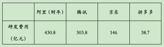 從研發費用來看,2019年騰訊的研發費用為303.8億元,京東是146億,拼多多是38.7億,而阿里2020財年是430.8億,阿里的研發投入居各大互聯網公司之首,與騰訊拉開了130億的差距。