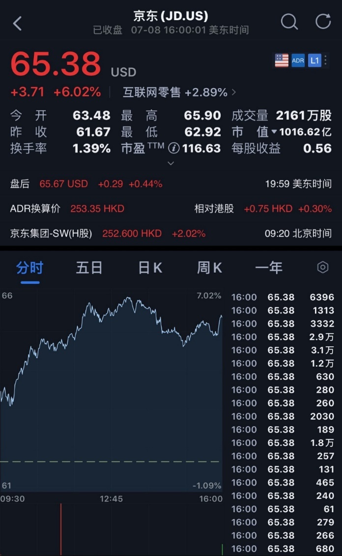 7月9日,京東(JD.US)股價達到65.9美元,市值首次站上千億美元