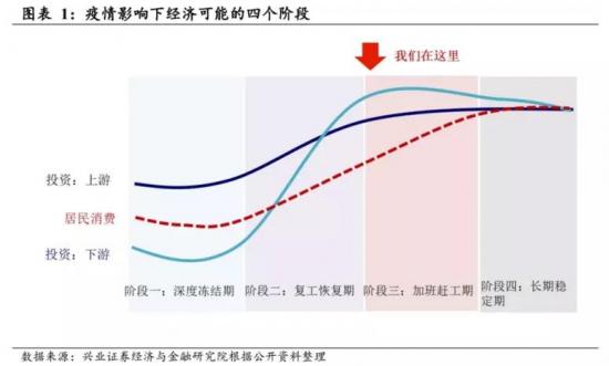 興業證券認為經濟最差的時候已經過去,5月經濟活動繼續改善,恢復程度:生產≈投資>消費。從當月同比數據來看,5月份改善程度:工業生產(4.4%)≈固定投資(3.9%)>消費(-2.8%);相比4月份數據,投資和生產的差距進一步縮小,消費增速逐漸回升。5月份或處于疫情下經濟修復從復蘇期向趕工期切換的第三階段。