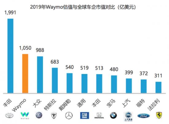 另外一個維度,從谷歌獨立出來做自動駕駛的子公司Waymo,摩根斯坦利曾給出700億美元的估值,截至2019年12月18日的市場數據,Waymo估值僅次于全球市值最高的車企豐田,達到1050億美元。