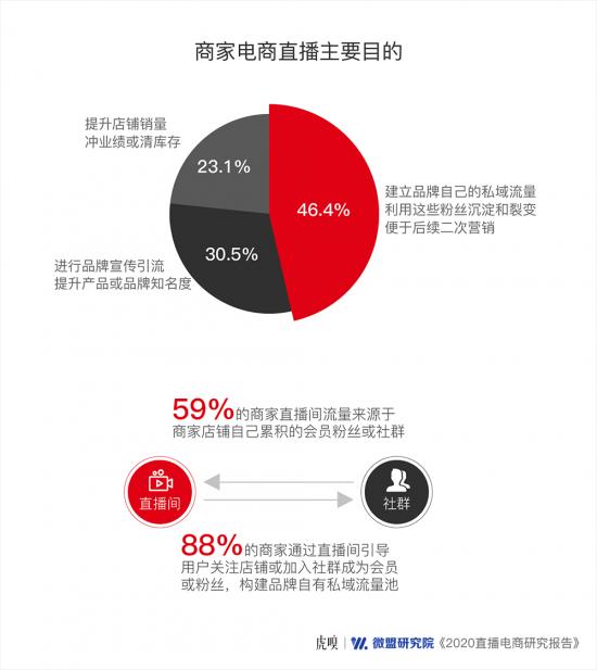 據報告顯示,建立品牌私域流量,利用粉絲沉淀和裂變進行二次營銷,成為商家做直播的主要目的,占比超過46.4%。并且59%的商家直播間流量的主要來源之一就是“私域流量”,88%的商家直播會引導用戶關注店鋪,成為會員或加入社群構建自己的私域流量。