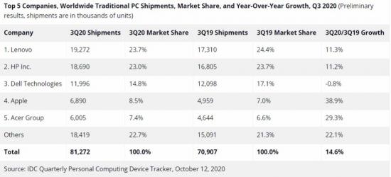 日前,IDC發布2020年第三季度的PC市場份額報告,在疫情的影響下,在線辦公、在線教育等產業新模式爆發,繼續推動傳統PC市場銷量增長,2020年第三季度全球PC出貨量同比增長14.6% 至8130萬臺。而聯想,也又一次重登出貨量榜首。
