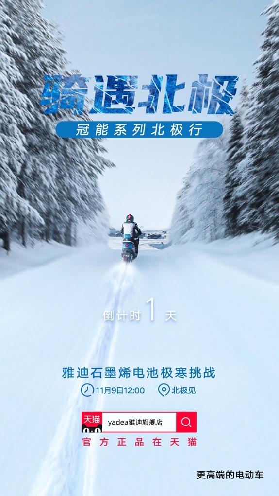 倒計(jì)時(shí)1天的海報(bào)中,是一輛正在冰天雪地中疾馳的雅迪冠能系列電動(dòng)車,兩側(cè)因高速行駛而顯得模糊的雪林,頗有“速度與激情”的味道。看來,本次直播必然會(huì)有一場極寒路況下的競速PK!