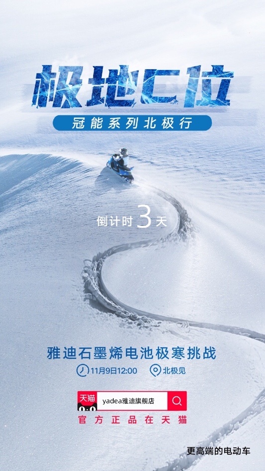 11月6日,雅迪官方放出了首張預(yù)熱海報(bào)。海報(bào)顯示,這場“雅迪石墨烯電池極寒挑戰(zhàn)”直播將于11月9日12點(diǎn)在北極進(jìn)行,雅迪石墨烯電池將在明星車型冠能系列的助力下,完成“極地C位”挑戰(zhàn)。