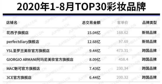 例如與完美日記常年同位競爭的花西子,后進之勢猛烈。據“聚美麗”發布的《2020年1-8月TOP30彩妝品牌》,完美日記不論是總交易金額還是客單價,都已經落后于花西子了。