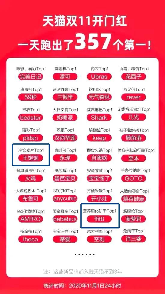 雙11大戰,4982億元的數字狂歡已落下帷幕,代餐江湖已現階段性王者。由于今年天貓規則相對特殊,第一波數據產生在11月1日-3日,其中,ffit8穩居營養消化餅干Top1,王飽飽則占據沖飲麥片Top1。
