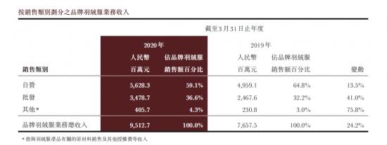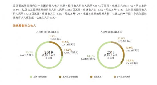 2017年2月13日,情人節前一天,波司登英國旗艦店也是海外唯一一家旗艦店低調關店。不過,有趣的是,這雖然是一次失敗的品牌國際化嘗試,但海外擴張的經歷,確實也為其在國內年輕消費者中豎立“國際范”品牌形象提供了話題,比如在2018年便提出“暢銷72國”的口號。但波司登國際化程度究竟如何?“螳螂財經”發現,2019財年(2020年3月31日公布)披露的數據中,波司登品牌羽絨服收入95.1億人民幣,而在羽絨服收入中又分為自營(零售)和批發,其中自營(零售)為56.283億,國內自營零售網絡總收入為48.66億,由此可見,波司登高達86.4%的收入依舊來自中國內地。