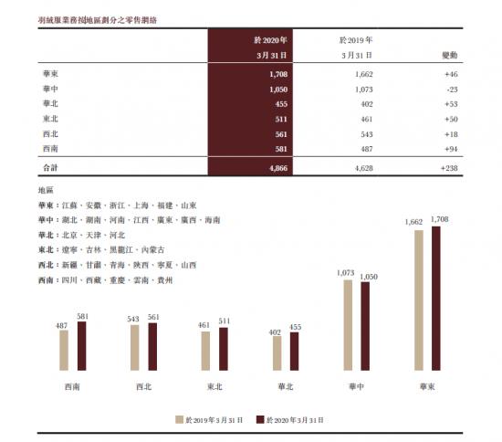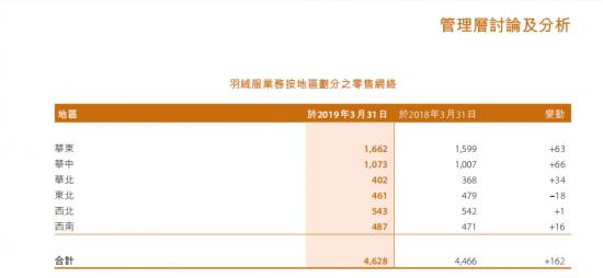 再往前看2018財年披露的數據,波司登品牌羽絨服收入占總收入比重為73.7%,約為77億人民幣,自營(零售)為49.59億,與此同時,年報同樣披露了國內自營零售網絡總收入為46.28億,由此可見,波司登高達90%的收入來自中國內地。
