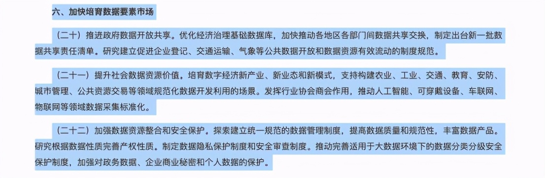 國(guó)家在政策號(hào)召上也做出了明確指示,《中共中央 國(guó)務(wù)院關(guān)于構(gòu)建更加完善的要素市場(chǎng)化配置體制機(jī)制的意見》第一次把數(shù)據(jù)與土地、勞動(dòng)力、資本、技術(shù)并列為生產(chǎn)要素,并強(qiáng)調(diào)了“加快培育數(shù)據(jù)要素市場(chǎng)”。