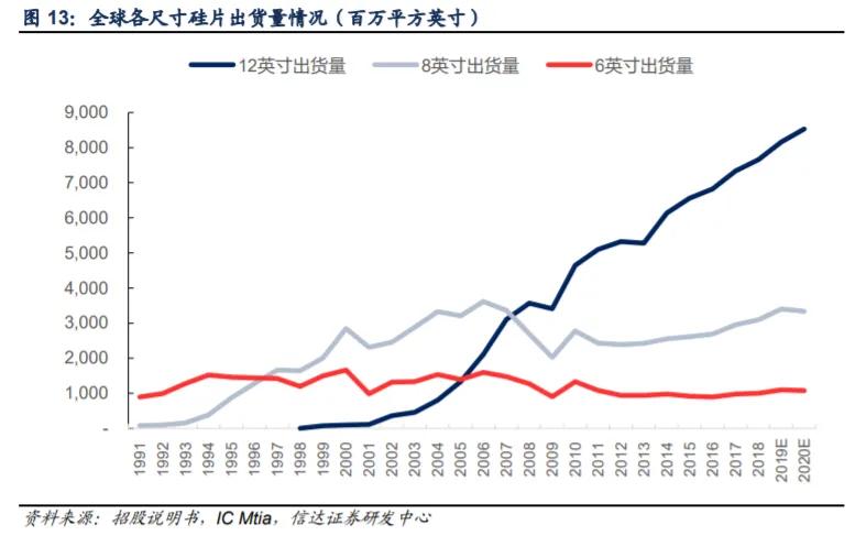可以看到,在幾種主要尺寸的硅片中全球出貨量最多的是12英寸硅片,且出貨量持續保持高增長,而8英寸和6英寸硅片出貨量需求明顯小于12英寸。這也反映出國內12英寸硅片供應與需求之間的矛盾關系!