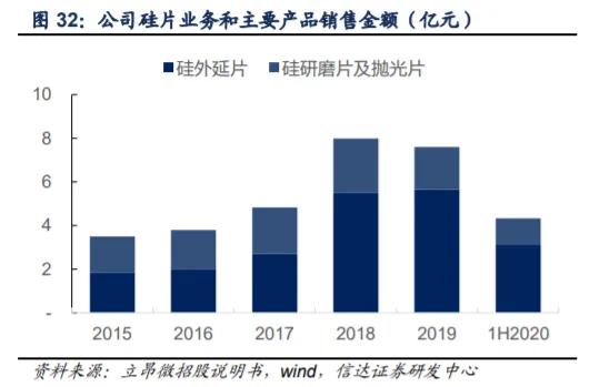 2019年,公司硅片業務實現營收7.59億,占公司總營收的比重為63.73%,為公司核心業務,其中毛利率較高的硅外延片營收占到公司總營收的47.51%;半導體分立器件芯片營收3.4億,半導體分立器件營收8149.76萬。
