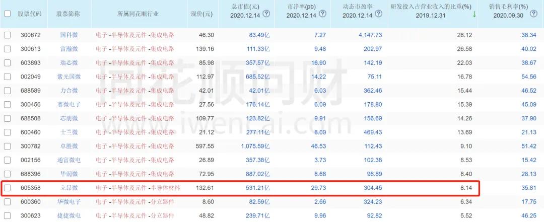 到2020年12月14日收盤,立昂微的股價達到132.61元/股,較4.92元/股的發行價已經上漲了26倍,最新市值已達531.21億,對應靜態市盈率已高達414.40倍,基本追平上市時與行業平均、各種“微”們的估值差!