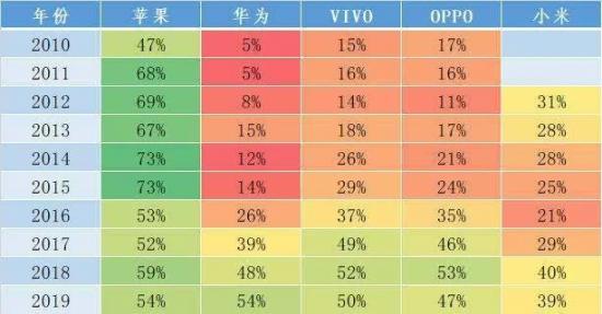 而在使用習慣和生態綁定的情況下,大多數消費者會在更換手機時,繼續使用原品牌。相關統計的數據也證實了這一點。以蘋果為例,常年維持在50%以上的品牌忠誠度。也就是說,有一半以上的蘋果手機用戶,在更換新手機時會繼續選擇蘋果。如果舊手機還夠用,誰會為新品買單呢?