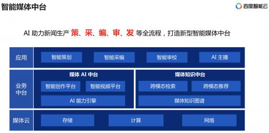 在百度智能云的智能媒體中臺體系下,媒體AI中臺負責技術,提供AI能力引擎等;媒體知識中臺負責內容,提供媒體知識圖譜等;媒體經營中臺負責渠道,提供分析、營銷、運營等功能。