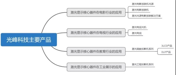 此后,光峰科技陸續(xù)推出了 ALPD激光電影放映解決方案(2014年)以及萬元內(nèi) 100 英寸激光電視(2017年)、全球首款菲涅爾柔性屏等;同時,光峰科技還廣泛探索了各種商用產(chǎn)品,覆蓋激光拼墻、激光商教機、激光工程投影機、激光微投等不同的產(chǎn)品線(附圖)。