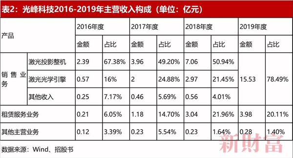 2018年開始,光峰租賃服務(wù)業(yè)務(wù)開始發(fā)力,收入占比逐漸由2016年的6.05%提升到20.11%(表2)。租賃服務(wù)主要是將激光光源以租賃的形式供給影院,這為光峰科技貢獻了長期穩(wěn)定的現(xiàn)金流。李屹表示:“影院的收費模式是可以源源不斷產(chǎn)生現(xiàn)金流和利潤的,一個光源就是一口油井,我只要把這個光源機裝到影院的影廳,這個廳就像一個油井,開始出油了”。