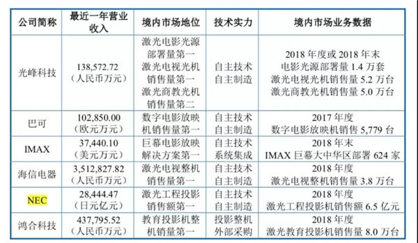 目前,光峰科技在激光電視領(lǐng)域的競爭對手主要有極米科技、海信、長虹、堅果等廠商,投影領(lǐng)域主要有NEC、鴻合等廠商,工程投影領(lǐng)域主要有NEC,影院領(lǐng)域的對手主要為巴可、IMAX(表3)。