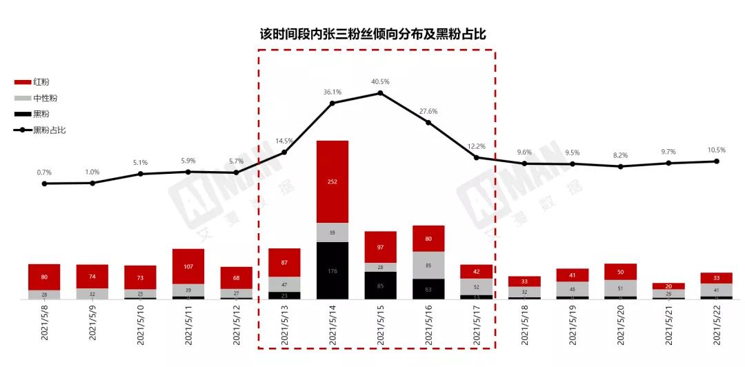 在張三的粉絲中,黑粉占比在負面事件發生后一度達到42.5% 。此后,盡管整體黑粉占比開始下降,但整體粉絲總量 相對事件前也有下降,換言之,粉絲“脫粉”情況很嚴重。這就說明,由于負面事件的發生,張三的人氣和口碑均出現銳減和下滑,對品牌方而言,他的代言風險將會增加。