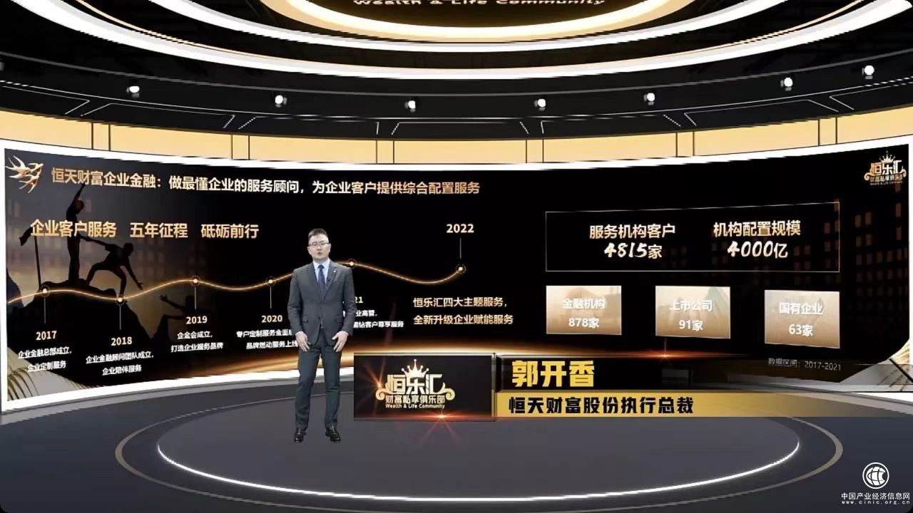 恒天財富股份執行總裁郭開香以《科技賦能,服務創新,財富共盈》為主題,分享了全新啟航的企業客戶服務的新服務、新體驗。他介紹,恒天財富企業金融總部成立于2017年,努力成為“最懂企業的服務顧問”,一直致力于為企業客戶提供綜合配置服務。截至2021年底,已服務機構客戶4815家。