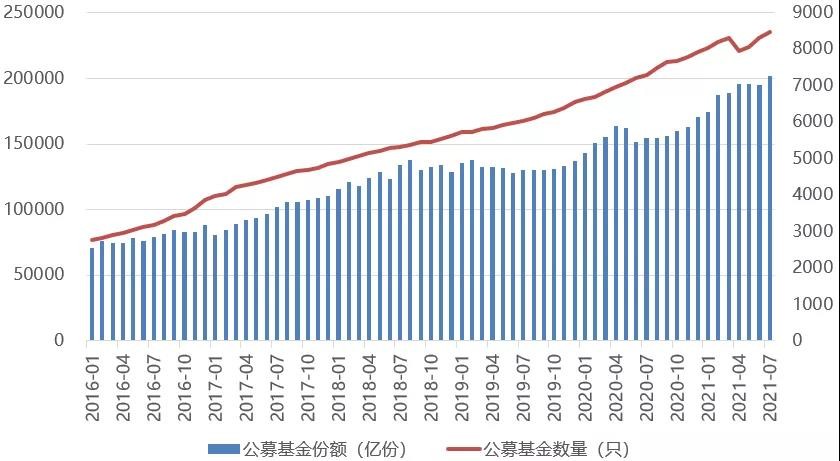 相比之下,公募基金和私募基金得益于資本市場的不斷成熟完善,管理規模得到迅速擴大。根據Wind統計,2016年初公募基金數量不到3000只,而截至2021年7月,數量已超過8000只,公募管理資產規模也達到23.5萬億元,較2016年底增長1.6倍,從全球第九上升至目前的全球第四,公募基金在資本市場穩定發展中發揮著日益重要的作用。