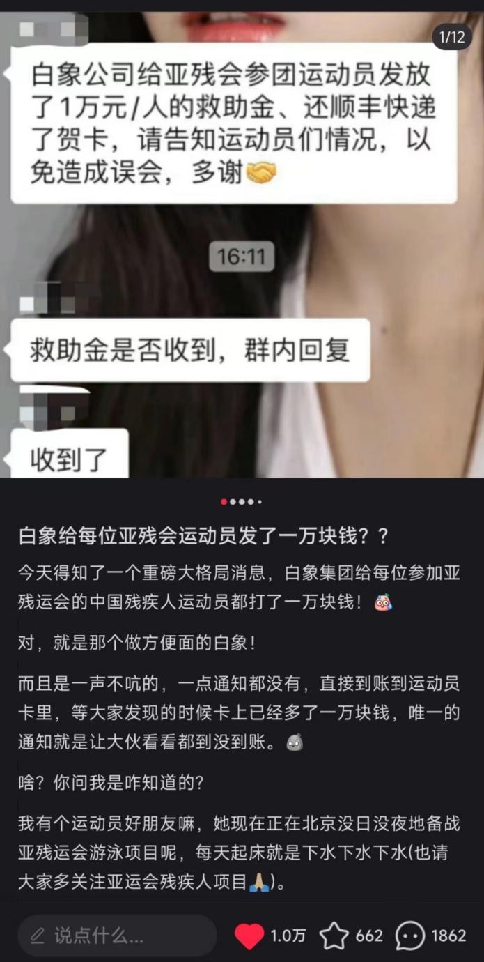 在爆料的帖子中,白象向運動員們表示希望低調,不用宣傳也不需要曝光,只希望他們安心備賽。隨后事情朝著令人感動的方向發(fā)展,網(wǎng)友們不希望這種好事被淹沒,在各大社交平臺自發(fā)宣傳,儼然一場無聲的接力。