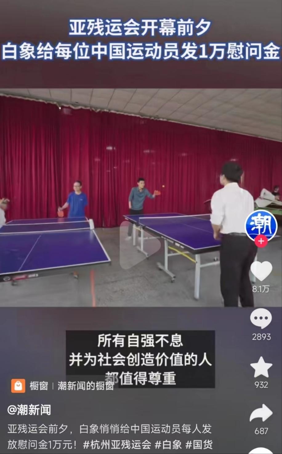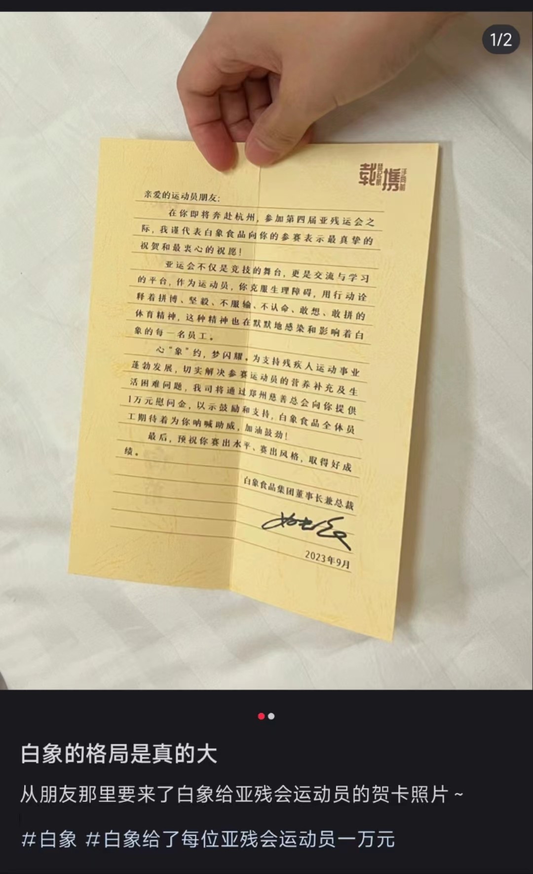 美好首先是來自社會的暖心互動。在本屆亞殘運會開幕前,殘奧會乒乓球冠軍茅經(jīng)典發(fā)文表示吃面只吃白象,隨后有網(wǎng)友主動解釋了原因,是因為白象悄悄向每位參加亞殘運會的中國運動員都發(fā)放了一萬元慰問金和一封慰問信。