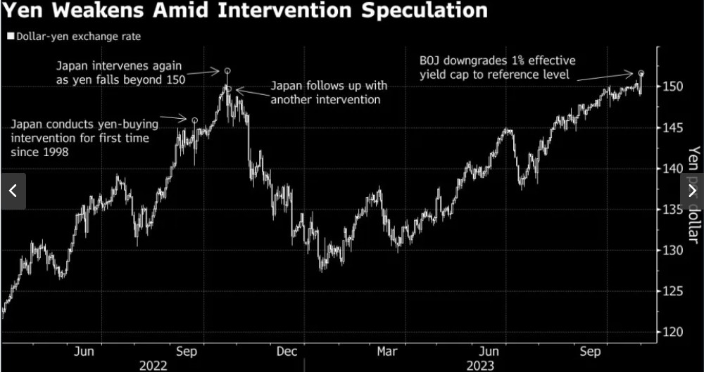 11月1日,日本財(cái)務(wù)部最高外匯官員就發(fā)出了迄今最嚴(yán)厲的警告之一,稱(chēng)當(dāng)局準(zhǔn)備干預(yù)外匯市場(chǎng),以阻止日元下跌。截至周11月1日中午,日本央行已準(zhǔn)備介入債券市場(chǎng),以減緩10年期國(guó)債收益率向1%攀升的速度。隨后,在宣布放松對(duì)債券收益率控制僅一天后,日本央行就出人意料地入市,遏制主權(quán)債收益率的上行步伐。隨著基準(zhǔn)10年期日本國(guó)債收益率觸及0.97%的十年新高,日本央行宣布了計(jì)劃外購(gòu)債操作。