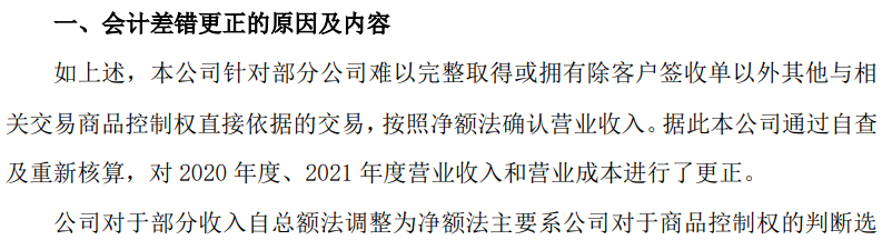 根據(jù)國聯(lián)股份發(fā)布的相關(guān)會(huì)計(jì)差錯(cuò)公告顯示,更正后,2020年?duì)I收調(diào)降23.39億、營業(yè)成本調(diào)降23.39億,2021年?duì)I收調(diào)降97.39億、營業(yè)成本調(diào)降97.39億。調(diào)整的原因是,公司將部分收入自總額法調(diào)整為凈額法。