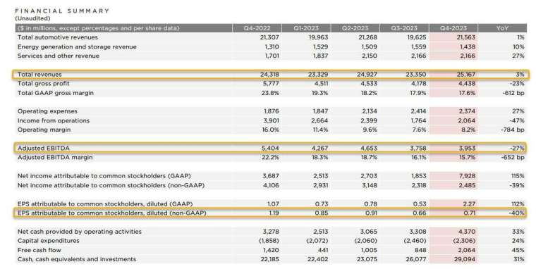 其主要收入來源為各類電動車銷售。但由于整體車市競爭激烈,各家車廠相繼調降電動車售價,導致此次財報呈現(xiàn)放緩趨勢。本季度收入為215.6億美元,占近86%的總收入,同比成長僅為1%,值得留意的是,在交車數(shù)量方面,同比去年卻實現(xiàn)了13%的增長。