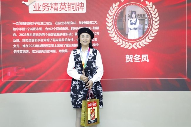 減肥項目類業務精英銅牌——賀冬鳳:一位湖南的辣妹子在湛江創業,在陌生市場奮斗,她越做越紅火,如今手握1個減肥市場,合伙2個面部市場,擁有6家直營店+加盟店。2023年抖音來的兩個顧客直接轉化開店;曾創下單月破20萬業績。她把美麗和事業帶給了越來越多的女性,也帶給了自己的女兒。她在2023年減肥進貨量上榮獲了第三屆圍美白手創富榜業務精英銅牌。